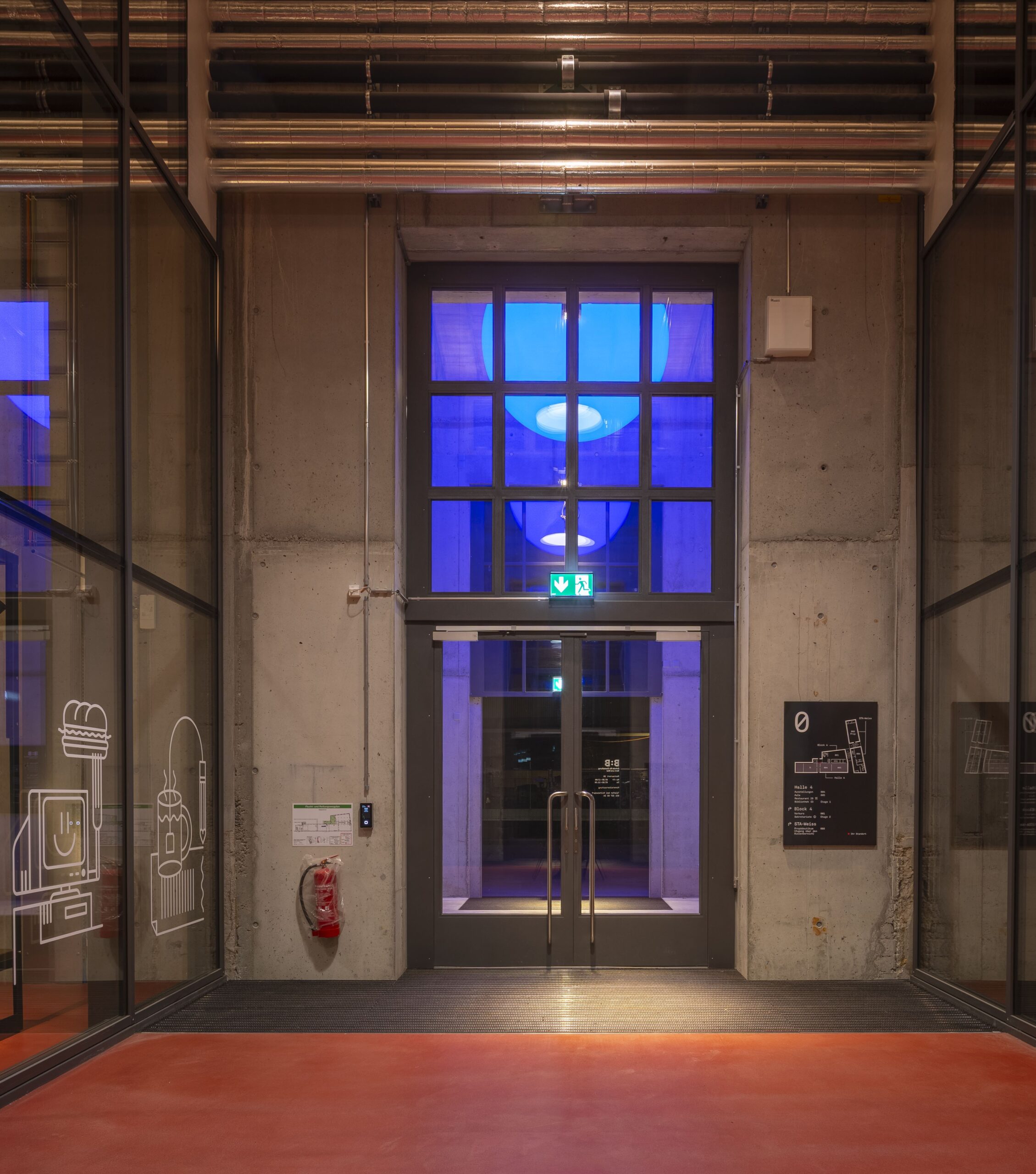 Das Licht ist Teil des Masterplans. Blau erinnert an Wasser und die industrielle Vergangenheit des Areals. Ein Gestaltungselement, dass bewusst keine Richtung vorgibt und genau darin liegt seine Wirkung.